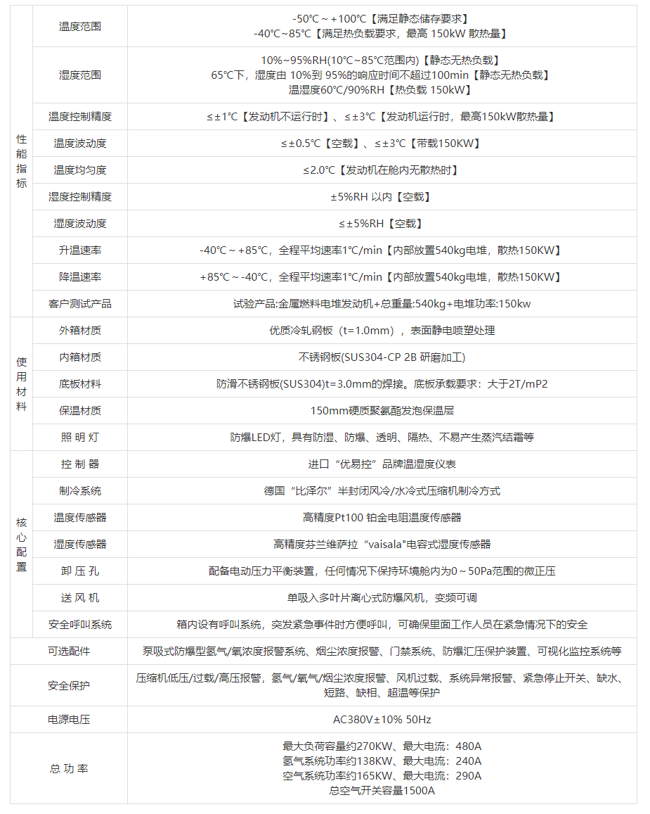 | 升溫速率 | -40℃~+85℃,全程平均速率1℃/min【內部放置540kg電堆,散熱150KW】 | |