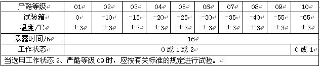恒溫恒濕試驗箱試樣在恒應(yīng)力狀態(tài)暴露期間,溫度變化應(yīng)十分緩慢以防止試樣損壞。用條件試驗方法11或12時,溫度變化階段應(yīng)保持最大的相對濕度,并在有關(guān)標(biāo)準(zhǔn)中說明試樣上是否允許出現(xiàn)凝露。恒溫恒濕試驗箱適用于航空航天產(chǎn)品、信息電子儀器儀表、材料、電工、電子產(chǎn)品、各種電子元氣件在高低溫或濕熱環(huán)境下、檢驗其各性能項指標(biāo)。     條件試驗10方法:低溫(下圖為條件試驗方法10低溫的嚴(yán)酷等級表)
