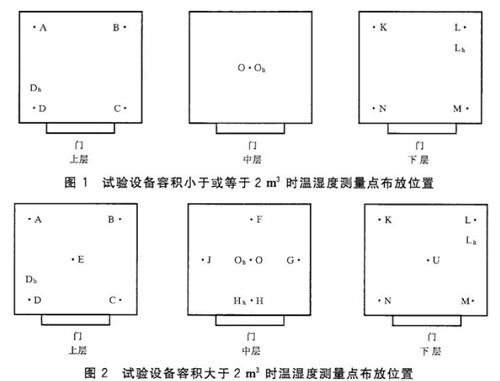 恒溫恒濕試驗(yàn)箱濕度測(cè)量?jī)x器采用干濕球溫度計(jì)或由其他濕度傳感器組成的濕度測(cè)量系統(tǒng),其測(cè)量結(jié)果的擴(kuò)展不確定度不大于被測(cè)溫度允許偏差的1/3。 恒溫恒濕試驗(yàn)箱濕度測(cè)量點(diǎn)數(shù)量及位置要求: 一,根據(jù)試驗(yàn)設(shè)備容積的大小,將工作空間分為上、中、下三層,中層通過工作空間幾何中心點(diǎn),將一定數(shù)量的相對(duì)濕度傳感器布放在其中規(guī)定的位置上,傳感器不應(yīng)受冷熱源的直接輻射。 二、相對(duì)濕度測(cè)量點(diǎn)用Oh、Dh、Hh、Lh表示。Oh位于中層的幾何心心,其他各測(cè)量點(diǎn)與試驗(yàn)設(shè)備內(nèi)壁的距離為各自邊長(zhǎng)的1/10,但最大距離不大于500mm,最小距離不小于50mm。 三、恒溫恒濕試驗(yàn)箱容積小于或等于2m3時(shí),相對(duì)濕度測(cè)量點(diǎn)為3個(gè),如圖1所示。試驗(yàn)箱容積大于2m3時(shí),相對(duì)濕度測(cè)量點(diǎn)為4個(gè),如圖2所示。當(dāng)試驗(yàn)箱容積小于0.05 m3或大于50 m3時(shí),可適當(dāng)減少或增加測(cè)量點(diǎn)。 四、每5min溫度平均變化速率測(cè)量點(diǎn)為工作空間幾何中心點(diǎn)。
