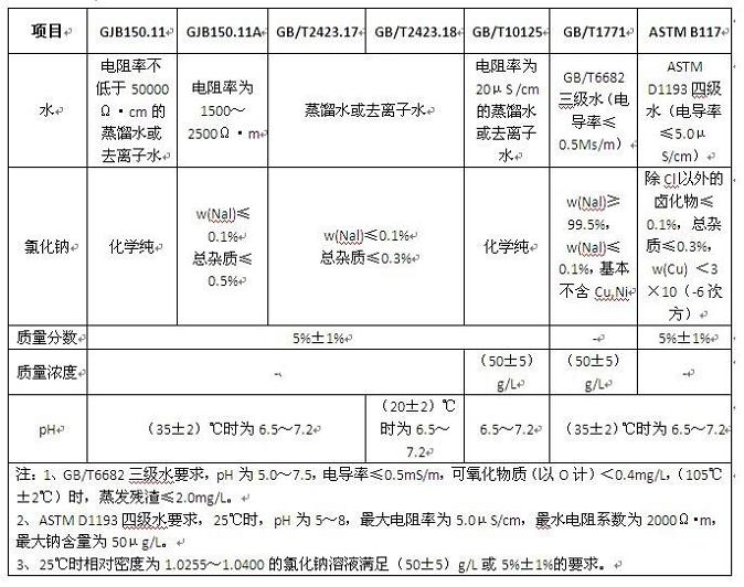 在鹽霧試驗(yàn)箱不同標(biāo)準(zhǔn)中對(duì)鹽霧試驗(yàn)用的鹽溶液有不同的要求,見(jiàn)下表: