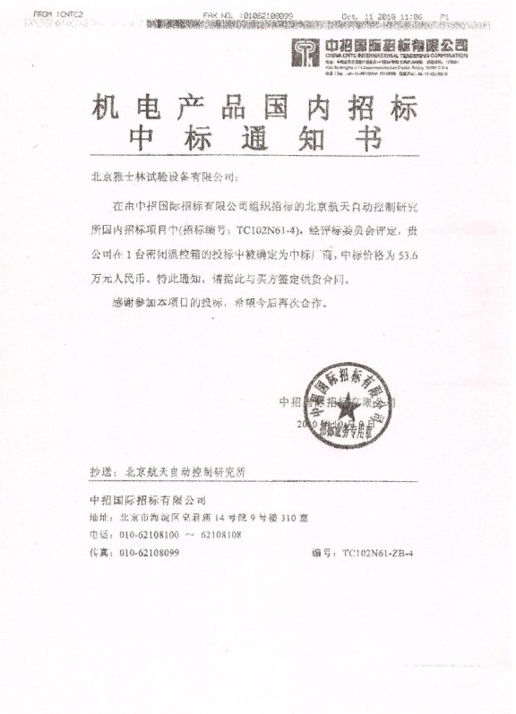 金秋十月,秋高氣爽!由中招國際招標(biāo)有限公司精心組織,在北京航天自動控制研究所2010年國內(nèi)項目二期招標(biāo)中,北京雅士林試驗設(shè)備有限公司憑借強(qiáng)大的綜合實(shí)力,以各項排名指標(biāo)均名列前茅的優(yōu)異成績成功中標(biāo)密閉溫控箱(招標(biāo)編號:TC102N61-4)項目工程。中標(biāo)金額為53.6萬元人民幣。 北京航天自動控制研究所2010年密閉溫控箱工程項目是該所2010年的重點(diǎn)項目。該項目的成功中標(biāo)進(jìn)一步確立了北京雅士林環(huán)境試驗設(shè)備在航天市場的領(lǐng)先地位,也為北京雅士林的的持續(xù)發(fā)展樹立了堅實(shí)的信心。在環(huán)境試驗設(shè)備市場競爭空前激烈的情況下,北京雅士林以有效的資源投入、專注的研發(fā)、前瞻的設(shè)計理念、嚴(yán)謹(jǐn)科學(xué)的生產(chǎn)管理制度、及時高效專業(yè)的工程服務(wù)隊伍換來了在技術(shù)、產(chǎn)品、市場各方面的良好口碑,并取得了優(yōu)異的市場成績。
