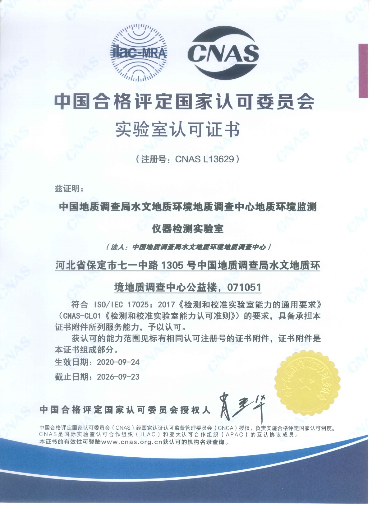 熱烈祝賀自然資源部中國(guó)地質(zhì)調(diào)查局水文地質(zhì)環(huán)境地質(zhì)調(diào)查中心地質(zhì)環(huán)境監(jiān)測(cè)儀器檢測(cè)實(shí)驗(yàn)室順利通過CNAS現(xiàn)場(chǎng)評(píng)審,并正式取得由中國(guó)合格評(píng)定國(guó)家認(rèn)可委員會(huì)(CNAS)頒發(fā)的實(shí)驗(yàn)室認(rèn)可證書。雅士林全體員工表示熱烈祝賀,同時(shí)也希望能夠加強(qiáng)和各個(gè)新老客戶之間的合作。